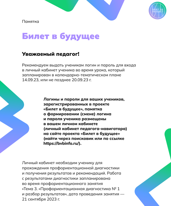 "Билет в будущее" — это уникальная возможность для каждого ученика и участника наших программ заглянуть в свое будущее, определить свои цели и построить путь к успеху. На сайте bvbinfo.ru мы предлагаем инструменты и ресурсы, которые помогают вам визуализировать свои мечты, поставить реальные задачи и шаг за шагом двигаться к желаемому результату.